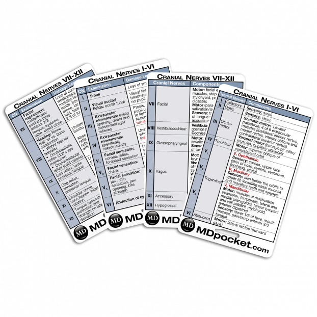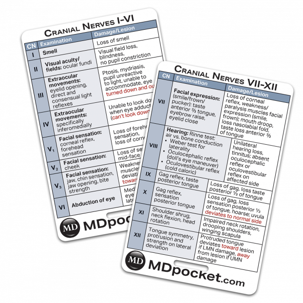The Rapid ID Cranial Nerves set lists out each cranial nerve function and examination. Use these cards to look for cranial nerve lesions or damage associated with each nerve. Rapid IDs are quick medical references used by healthcare professionals that can be carried behind your ID badge. Have a quick and easy way to have medial information at your fingertips.