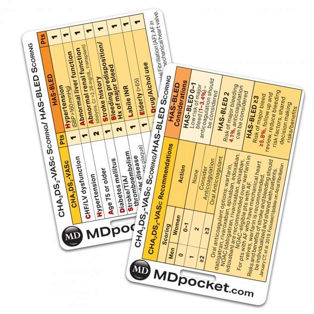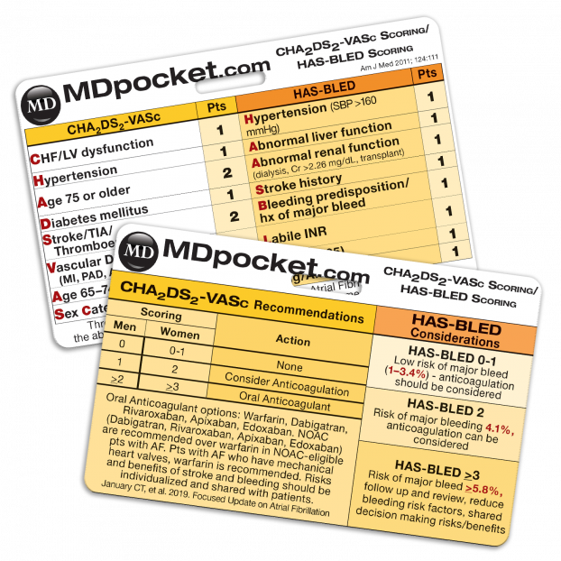 The quickest way to assess patients for the use of anticoagulation in atrial fibrillation is with our Rapid ID card. Designed to be carried behind your hospital or clinic ID, this card makes referencing CHADS and CHADS-VASc a breeze. Our Rapid ID - CHADS card is great for scoring your patients with atrial fibrillation and gives recommendations on whether or not to use anticoagulation. Each card is made of strong durable plastic with full color views that will last as long as you want to carry it. Horizontal and vertical layouts available.